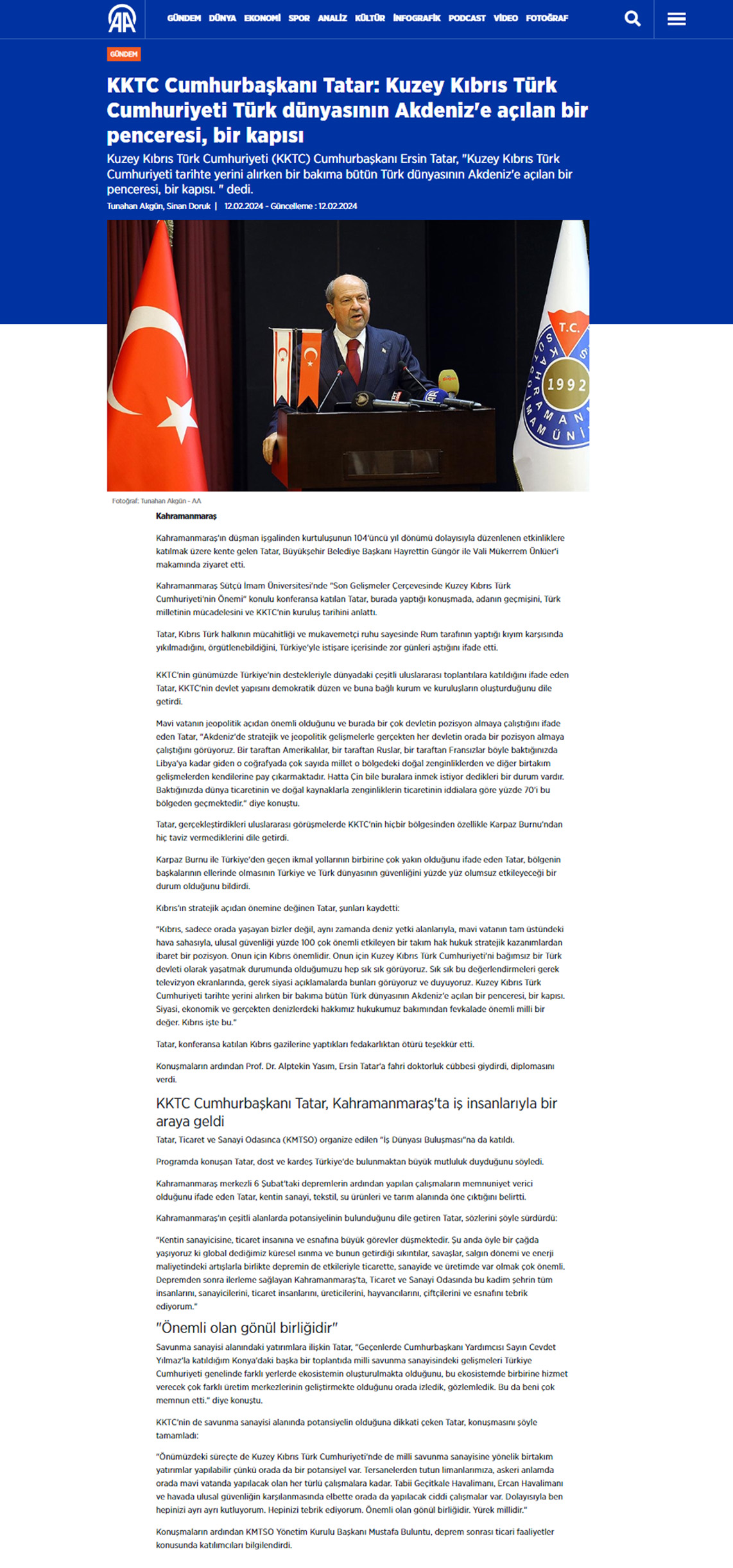 Haber Linki: https://www.aa.com.tr/tr/gundem/kktc-cumhurbaskani-tatar-kuzey-kibris-turk-cumhuriyeti-turk-dunyasinin-akdenize-acilan-bir-penceresi-bir-kapisi/3135348#
