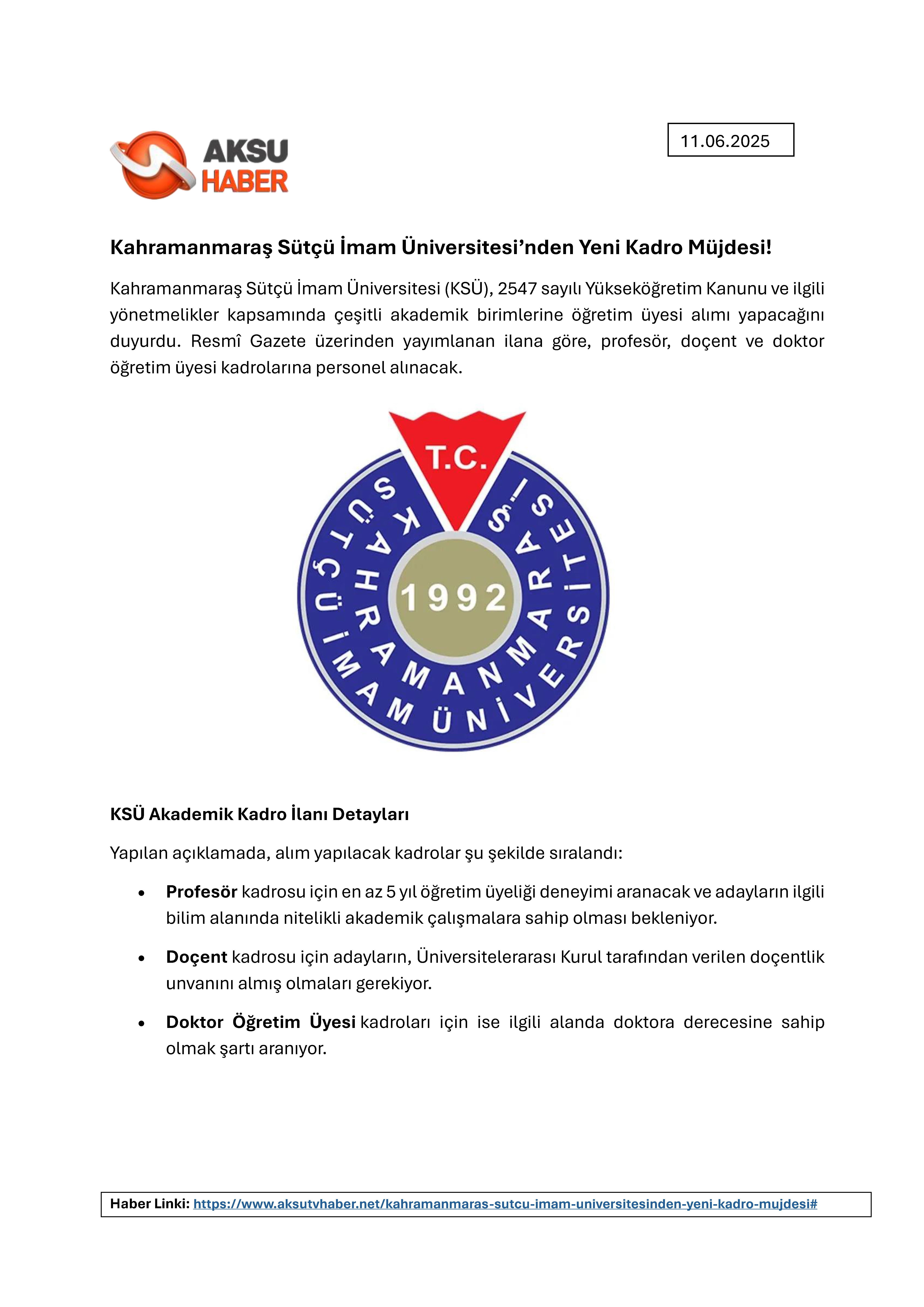 Kahramanmaraş Sütçü İmam Üniversitesi’nden Yeni Kadro Müjdesi!